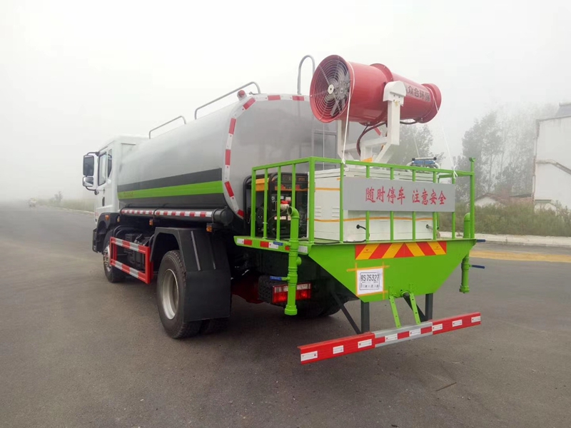 4500軸距,玉柴200馬力/康機210馬力發(fā)動機,法士特8檔變速箱,10.00鋼絲胎,前橋4.5T后橋10T 原廠空調(diào),容積15立方米,ABS ,采用大流量水泵,大通徑球閥、基本灑水功能前沖、后灑、側(cè)噴、工作平臺帶軸承高炮(可調(diào)節(jié)成霧狀、直柱狀)、可泵進泵出、罐體兩側(cè)圓形炮筒、帶兩根抽水軟管,尾部加裝30米霧炮機組。