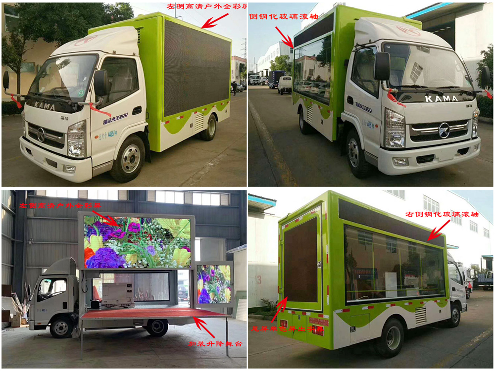 廣告車選裝配置:客戶可根據需求選裝屏幕清晰度(P10彩屏、P8彩屏、P6彩屏、P5彩屏、P4彩屏)、單面彩屏、雙面彩屏、雙面